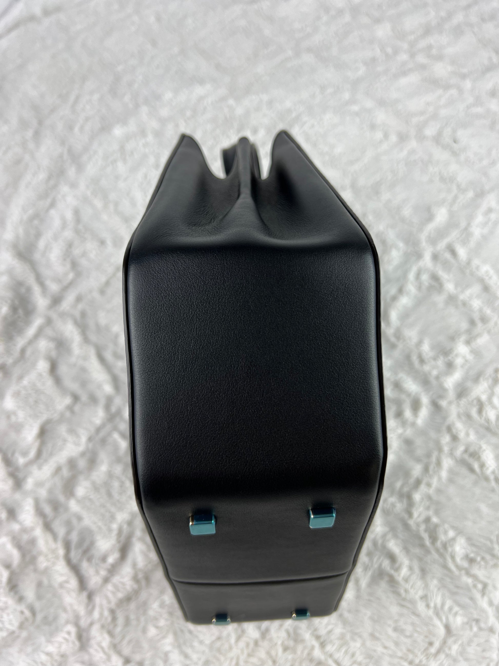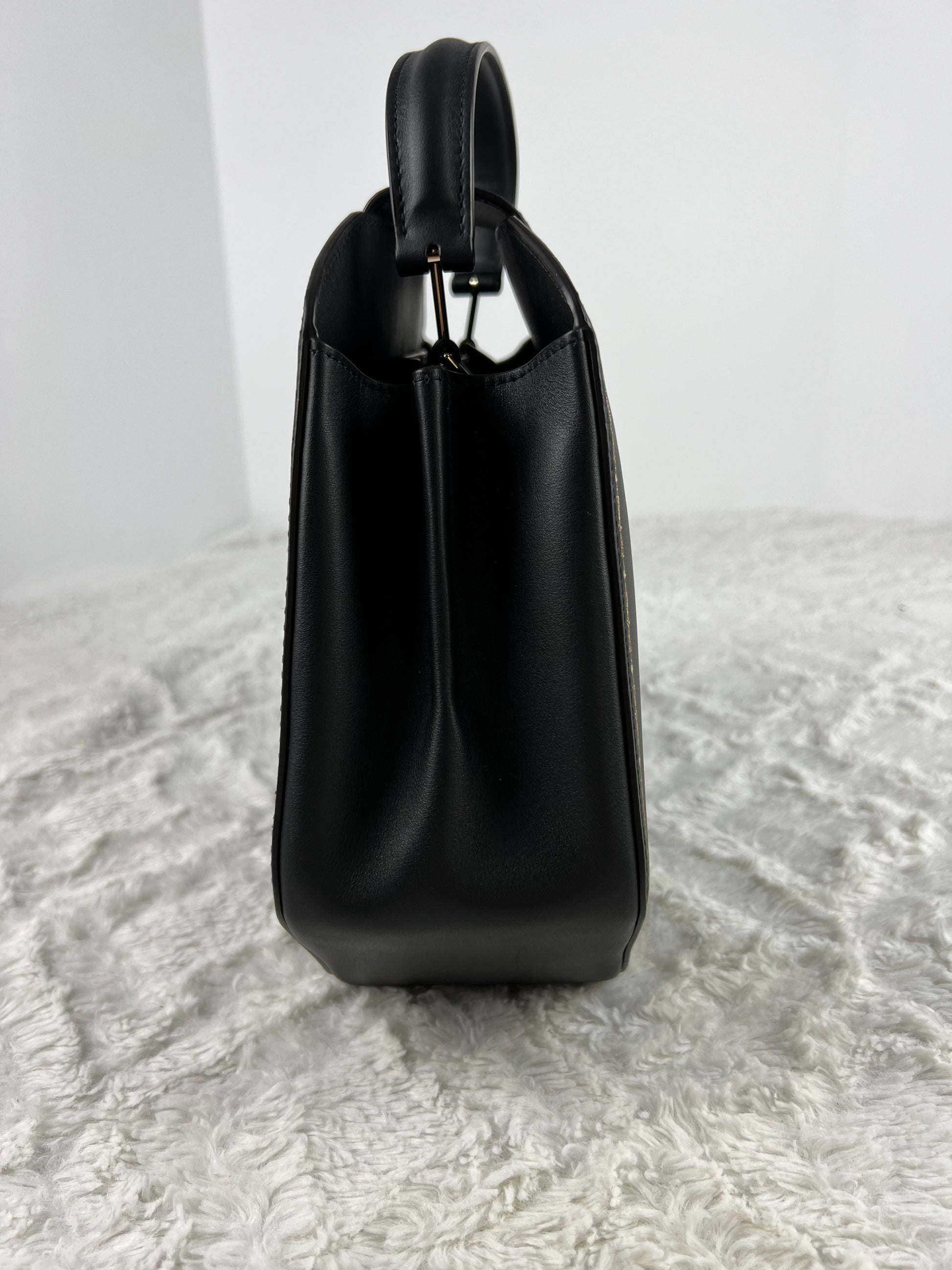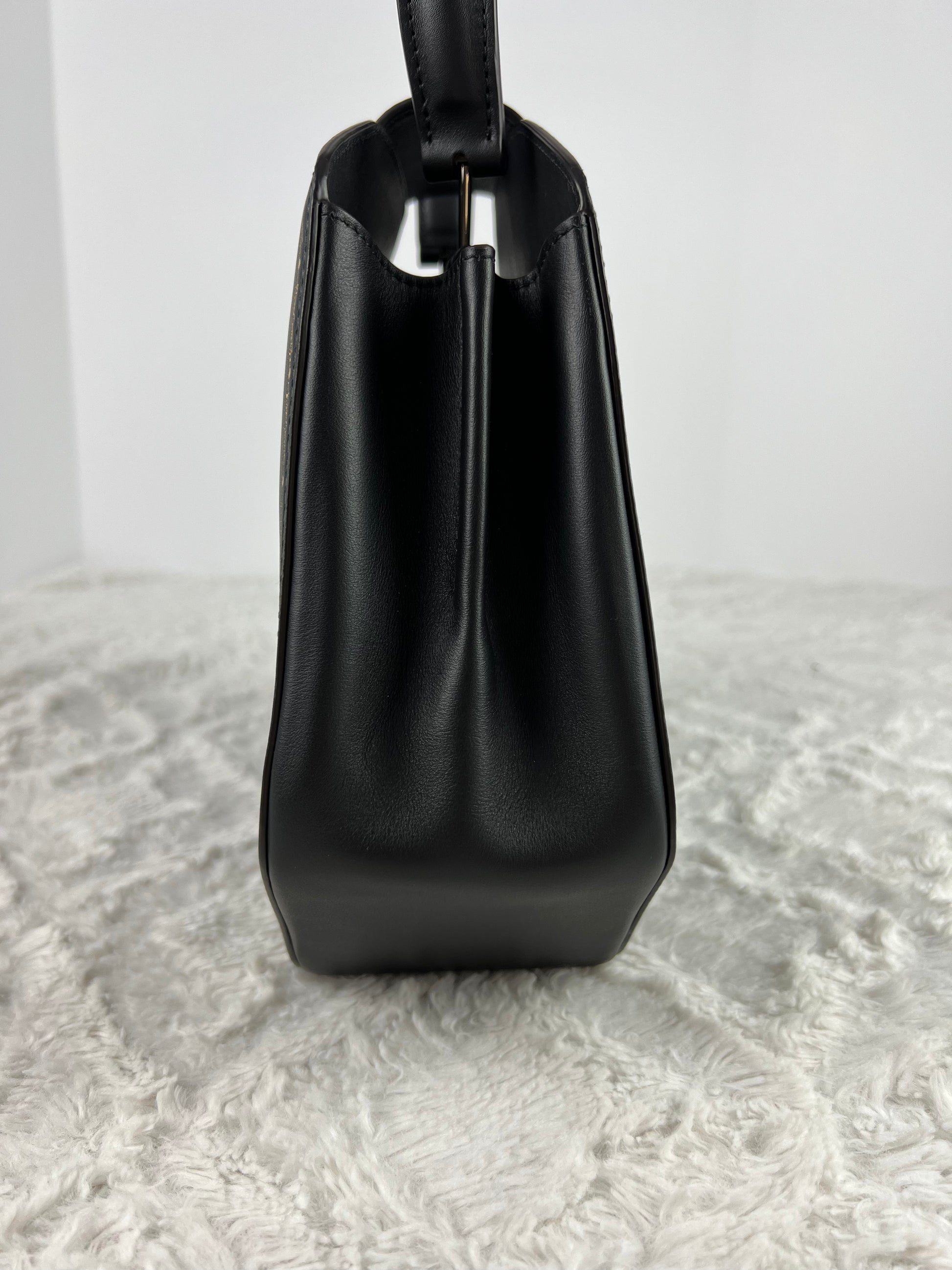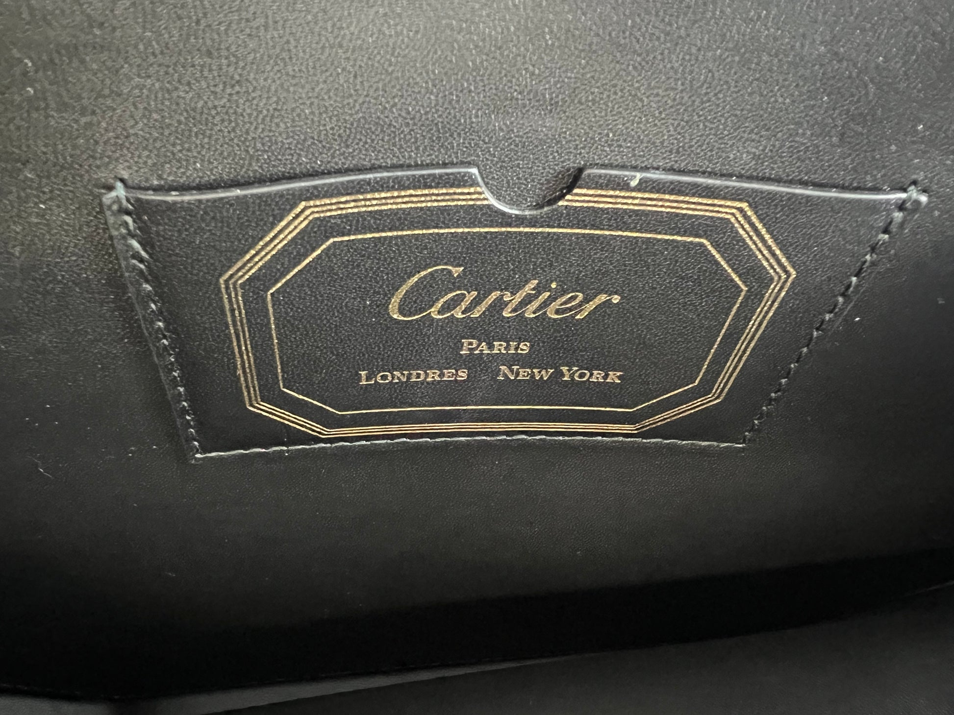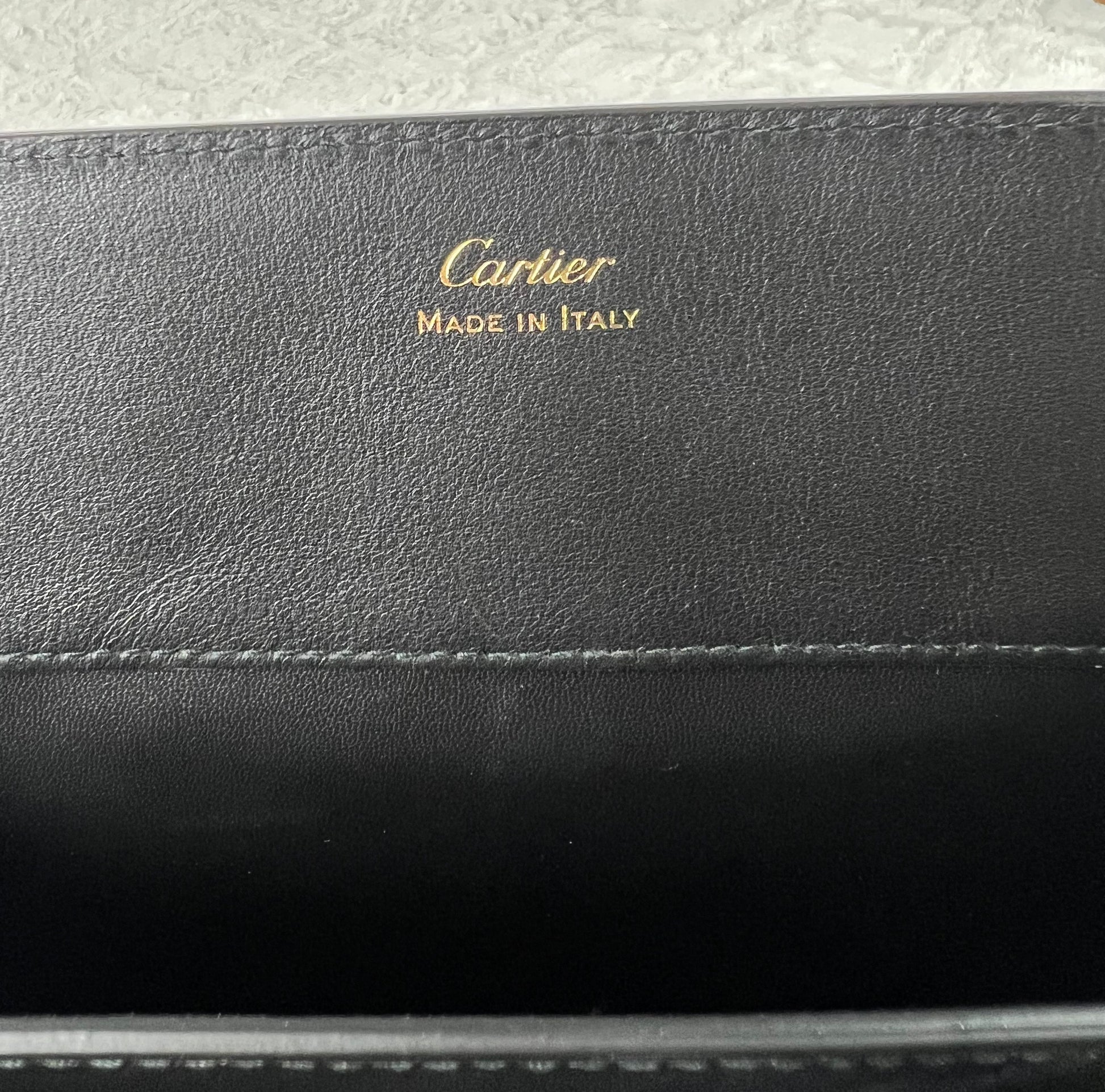 This Mini model bag is black calfskin, golden garland motif, golden hot stamped “Cartier” signature inside. Two inside compartments, a signature pocket with removable mirror. Lining: black calfskin.