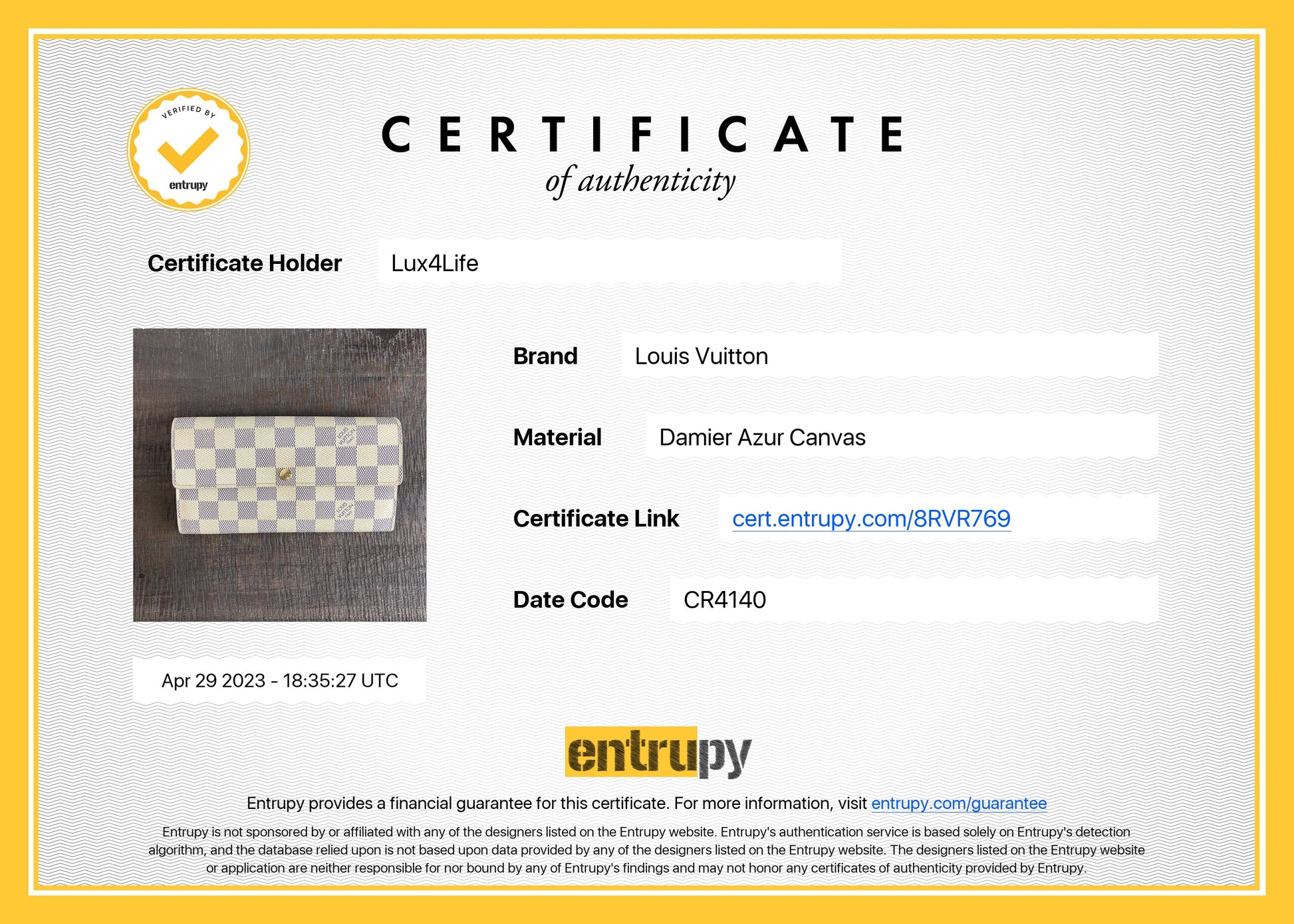 Description: This stylish wallet is in the signature Louis Vuitton Damier Azur coated canvas. The interior features card slot panels, bill pockets, and a central zipper compartment.
